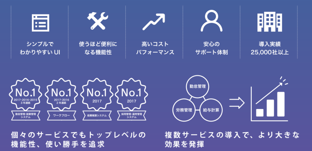 勤怠管理、給与計算、労務管理、採用管理、経費精算、ワークフローの6つのサービスがあり、