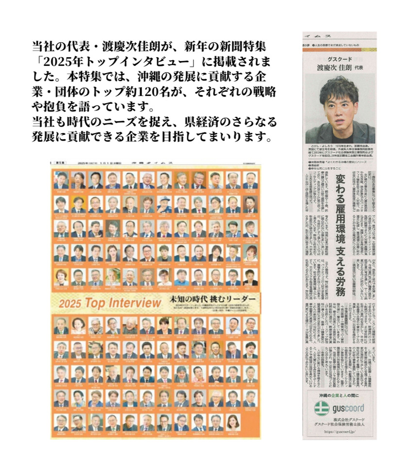 メディア掲載media HOME新着一覧メディア掲載沖縄タイムス2025年新春トップイ... 2025.01.06 Media 沖縄タイムス2025年新春トップインタビューに代表 渡慶次 佳朗のインタビューが掲載されました。 沖縄タイムスWeb版に掲載されました。 ぜひこちらからご覧ください。 変わる雇用環境 支える労務 グスクード 渡慶次佳朗 代表 [トップインタビュー] 🔗 記事はこちら 沖縄タイムス2023年新春トップイ... 【沖縄の士業”初”】「沖縄を代表す... 最近の投稿 2025.06.13 【沖縄の士業”初”】「沖縄を代表す... 2025.01.06 沖縄タイムス2025年新春トップイ... 2023.01.04 沖縄タイムス2023年新春トップイ... 2022.09.17 特定技能外国人の受け入れについてイ... 月間アーカイブ 月を選択してください 2025年6月 (1) 2025年1月 (1) 2023年1月 (1) 2022年9月 (1) 2022年1月 (1) 2020年7月 (1) 2020年5月 (1) 2019年6月 (1) 2019年5月 (1) 2017年7月 (1) 2016年7月 (1) 2015年11月 (1) 2015年9月 (1) 2015年8月 (1) 2014年1月 (1) 2013年8月 (1)